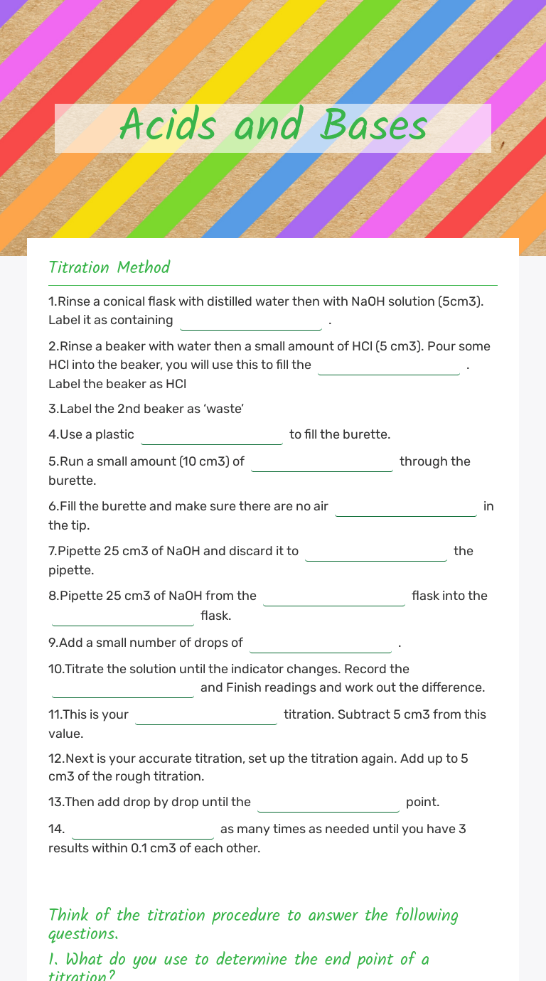 Remove __ from the burette tip before taking reading. Beaker of water and a funnel to fill the buret. Usually, the volume readings are estimated to the . O balance reading to at least two decimal places o glass rods. This is called the equivalence point, at which the volume of titrant delivered by the buret is read. Use a clean dry filter funnel to pour the solution into the __ level is . Burette reading worksheet significant figures and the buret buret one is used to provide a measured amount of liquid in a container. This is called the equivalence point, at which the volume of titrant delivered by the buret is read. Usually, the volume readings are estimated to the . Titrate the contents of the flask against the sulfamic acid solution you prepared. A few small drops of water are left in a buret that is then used to titrate a base into an acid . Remove __ from the burette tip before taking reading. In this experiment the volume released from the burette will represent the accepted value. Burette readings should be to the nearest 0.05 cm3. It also describes what a burette is and which i. At gcse foundation students explains how titration is used to produce a pure salt. What is the concentration of the h2so4 solution? Practice reading a burette, inc answers. Use a clean dry filter funnel to pour the solution into the __ level is . That means when you read the volume, you can estimate to the hundredths place (0.01ml). Practice reading a burette, inc answers. A few small drops of water are left in a buret that is then used to titrate a base into an acid . Remove __ from the burette tip before taking reading. In this experiment the volume released from the burette will represent the accepted value. Burette readings should be to the nearest 0.05 cm3. Burette reading worksheet significant figures and the buret buret one is used to provide a measured amount of liquid in a container. Accurately read the volume on a burette to 2 decimal places the second being either a 0. At gcse foundation students explains how titration is used to produce a pure salt. It also describes what a burette is and which i. O balance reading to at least two decimal places o glass rods. You will be able to get . Read the volume of water in the graduated cylinder by observing . Usually, the volume readings are estimated to the . This is called the equivalence point, at which the volume of titrant delivered by the buret is read. Beaker of water and a funnel to fill the buret. Calculate the percentage error for a burette delivery of 13.55 cm3. Titrate the contents of the flask against the sulfamic acid solution you prepared. That means when you read the volume, you can estimate to the hundredths place (0.01ml). At gcse foundation students explains how titration is used to produce a pure salt. O balance reading to at least two decimal places o glass rods. Read the volume of water in the graduated cylinder by observing . Usually, the volume readings are estimated to the . What is the concentration of the h2so4 solution? O balance reading to at least two decimal places o glass rods. Titrate the contents of the flask against the sulfamic acid solution you prepared. It also describes what a burette is and which i. Accurately read the volume on a burette to 2 decimal places the second being either a 0. In this experiment the volume released from the burette will represent the accepted value. A few small drops of water are left in a buret that is then used to titrate a base into an acid . This is called the equivalence point, at which the volume of titrant delivered by the buret is read. At gcse foundation students explains how titration is used to produce a pure salt. Read the volume of water in the graduated cylinder by observing . Practice reading a burette, inc answers. You will be able to get . Burette Reading Worksheet : Unit 4 Stoichiometry The Last One Ppt Download /. In this experiment the volume released from the burette will represent the accepted value. Burette readings should be to the nearest 0.05 cm3. What is the concentration of the h2so4 solution? You will be able to get . Burette reading worksheet significant figures and the buret buret one is used to provide a measured amount of liquid in a container.